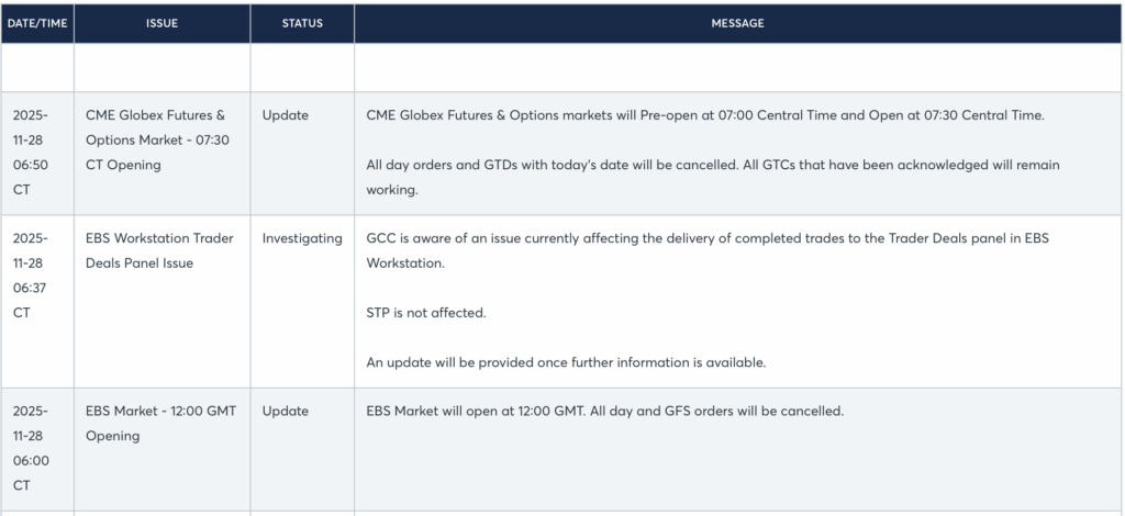 Numerous brokerages have confirmed the CME markets problems. The list includes (among others) IG, OANDA, FOREX.com, eToro. All of these companies said they are monitoring the situation and will provide updates.