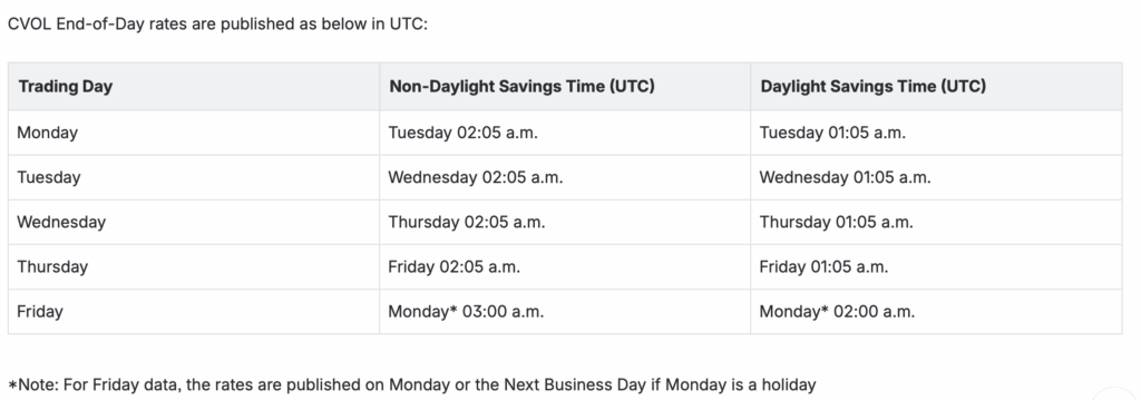 The CVOL End-of-Day API is available 24 hours a day, 7 days a week. Clients systems should consider all returned data to be accurate at the time of the request submission.