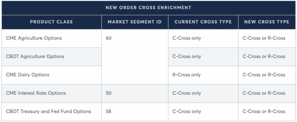 Starting Sunday, February 22, 2026 (trade date Monday, February 23), international derivatives marketplace CME Group will implement the new order cross enrichment for select options products.