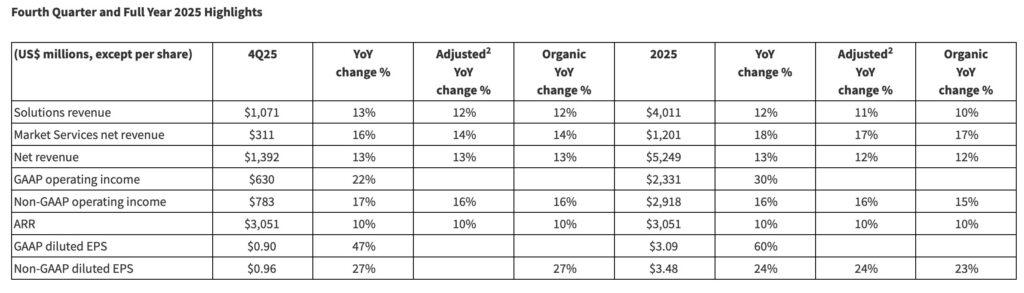 Solutions revenue in 2025 was $4.0 billion, an increase of 12% versus the prior year period, or 11% on an adjusted basis. Fourth quarter 2025 Solutions revenue was $1.1 billion, up 13% versus the prior year period, or 12% on an organic basis, reflecting strong growth from Index and Financial Technology.