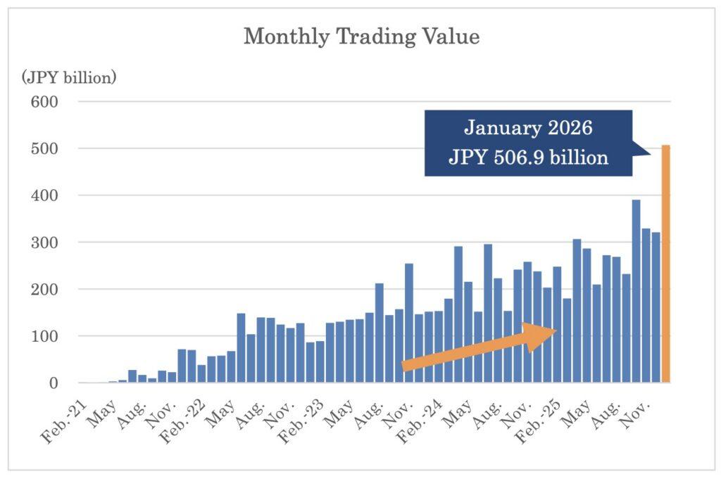 Tokyo Stock Exchange, Inc. (TSE) announced today that the monthly trading value via CONNEQTOR reached a record high of JPY 506.9 billion in January 2026.