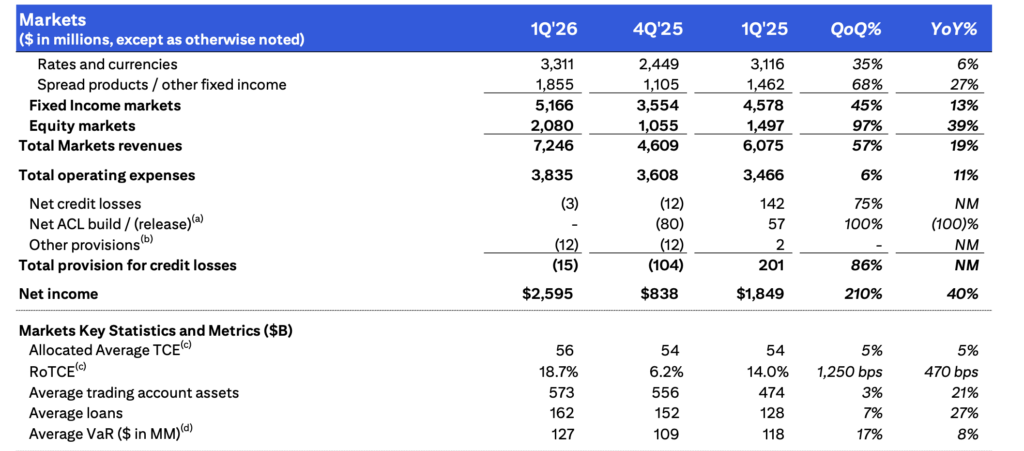 “We’re off to an exceptionally strong start in 2026, with revenue up 14% and net income growing 42%. Services had an outstanding quarter with revenue up 17% and Markets crossed $7 billion in revenue.