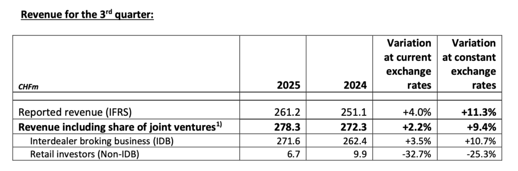 For the first nine months of the year, Compagnie Financière Tradition reported consolidated revenue, including the share of joint ventures, of CHF 910.4 million, compared with CHF 849.3 million for the same period in 2024, an increase of 11.3% at constant exchange rates.