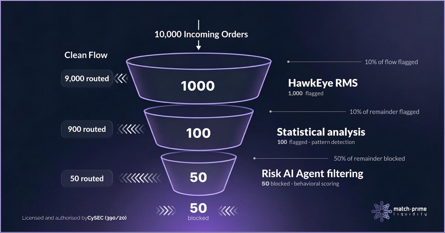 The system operates within a timeframe that is still commercially and operationally relevant. Its role is not simply to analyse suspicious behavior after the fact, but to constrain it while intervention can still make a difference. In practice, it delivers a level of decision speed that is effectively unattainable for humans, even with a 24/7 dealing team monitoring the flow.