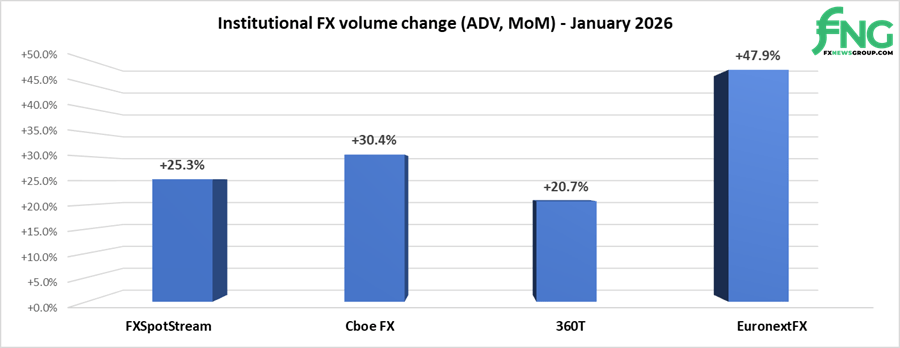 Each of FXSpotStream, Cboe FX, EuronextFX and Deutsche Borse’s 360T saw month-over-month trading volume increases of 20%+ in January 2026, and that despite December 2025 being fairly strong, in line with volumes seen in November 2025.