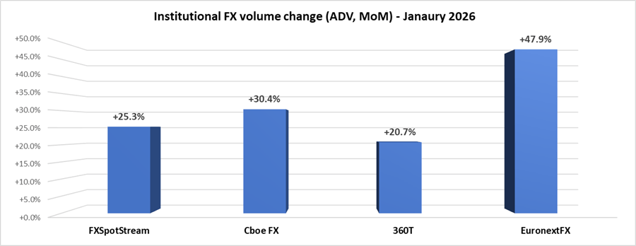 Each of FXSpotStream, Cboe FX, EuronextFX and Deutsche Borse’s 360T saw month-over-month trading volume increases of 20%+ in January 2026, and that despite December 2025 being fairly strong, in line with volumes seen in November 2025.