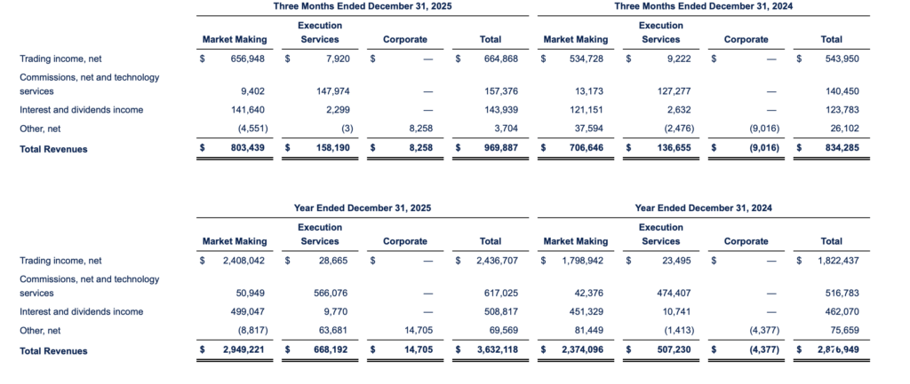 Total revenues increased 16.3% to $969.9 million for the fourth quarter of 2025, compared to $834.3 million for the same period in 2024. Trading income, net, increased 22.2% to $664.9 million for the quarter compared to $544.0 million for the same period in 2024. Net income totaled $280.6 million for this quarter, compared to net income of $176.1 million in the prior year quarter.