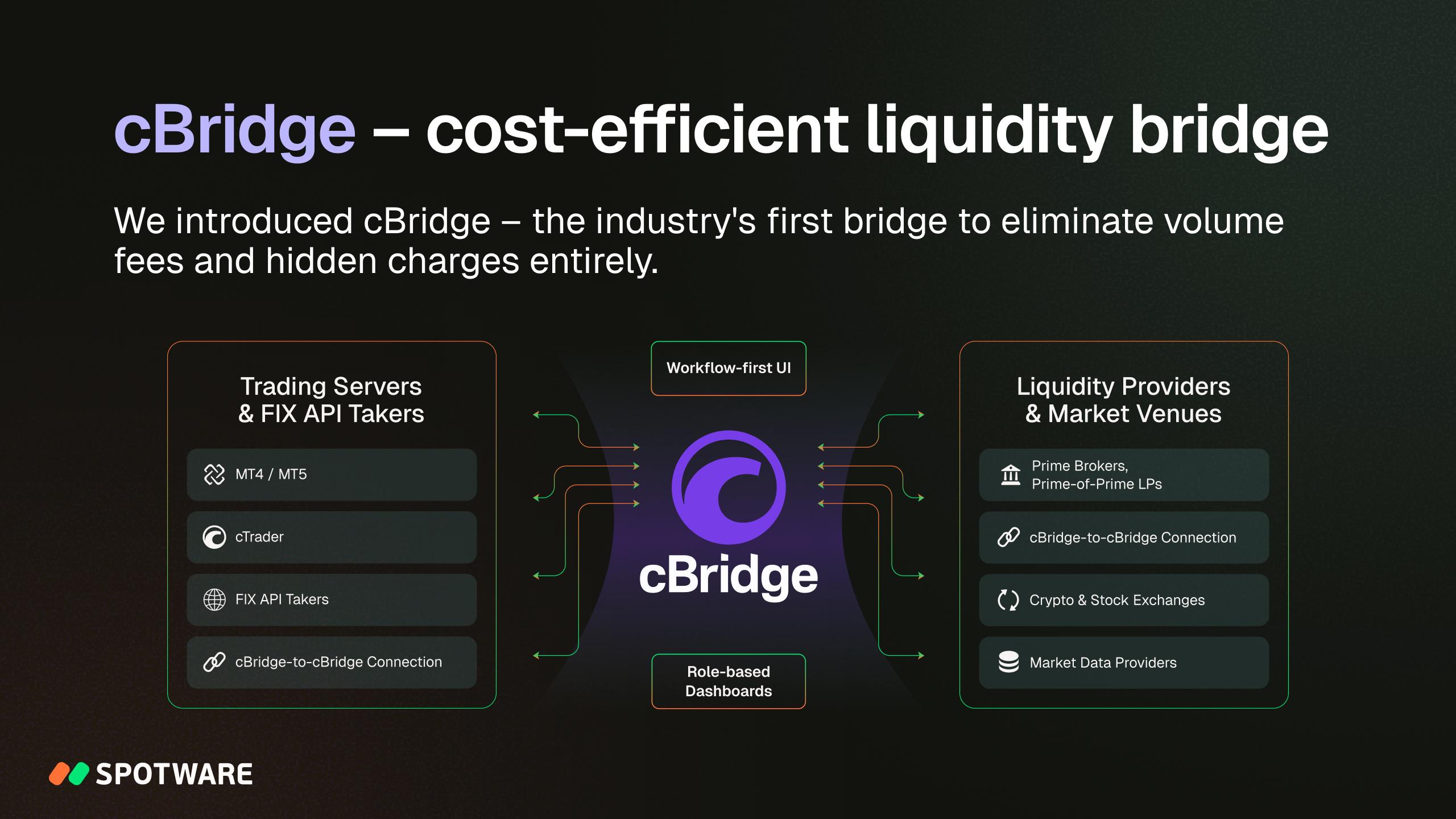 After years of development, Spotware introduced cBridge to the market in 2025. A modern, broker-focused solution for liquidity connectivity, cBridge is highly cost-efficient, eliminating volume fees and hidden charges entirely. It combines a scalable modular architecture and workflow-first design. The validation of cross-settings and intuitive health checks of rule sets ensure safe operation.