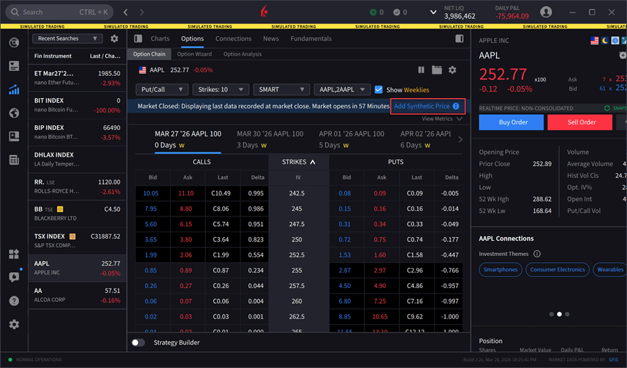 The Synthetic Price option will populate in the Option Chain before or after market hours.
