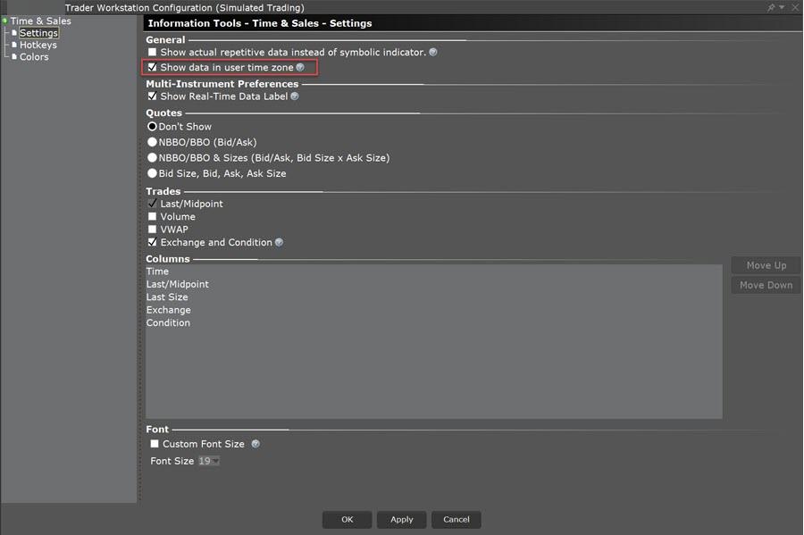 TWS users can choose whether Time & Sales data is shown in the instrument’s time zone or their own. To change this setting, click the configuration (gear) icon in the top-right corner of the Time & Sales window and open Settings. By default, Show data in user time zone is selected, displaying data in the user’s local time. Uncheck this box to display data in the instrument’s time zone.