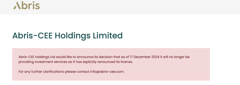 The Cyprus Securities and Exchange Commission (CySEC) has withdrawn the Cyprus investment firm (CIF) license of Abris-Cee Holdings Ltd.