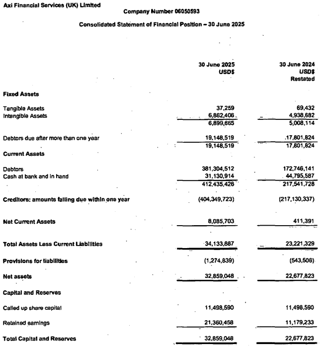 Axi UK’s FY2025 income statement and balance sheet follow.