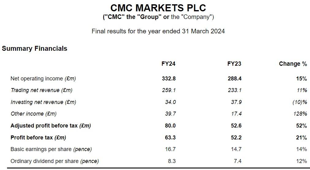 CMC Markets Revenues top previous guidance at £333 million for FY2024, up 15% YoY