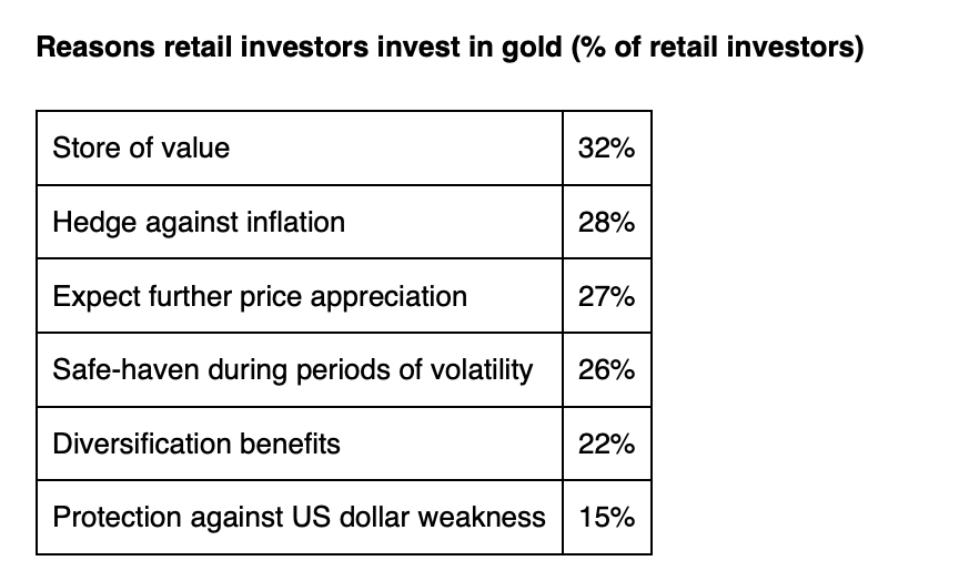 In light of gold’s strong gains over the past year, expectations for the next six months remain measured. Retail investors forecast an average rise of 3.1%, with millennials and boomers the most bullish (3.4%), while Gen Z is more cautious at 2%. The most common view is that prices will increase by 5-10% (18%), followed by 1-5% (17%) and that prices will remain broadly unchanged (14%).