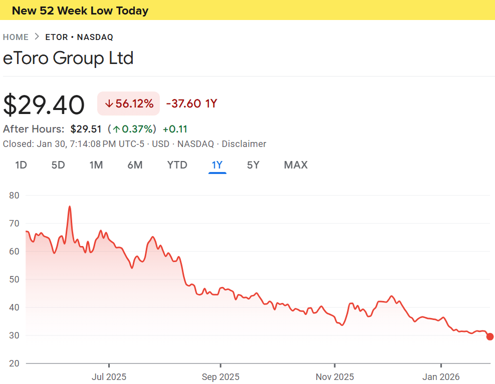 Public market investors seem to be showing increasing concern over online broker eToro (NASDAQ:ETOR), sending shares of the company down by another 2.7% on Friday. eToro shares set an all-time low (since eToro’s May 2025 IPO) at $29.05 during Friday’s session, before closing the day at $29.40 – the first time that eToro shares have closed below the $30 level.