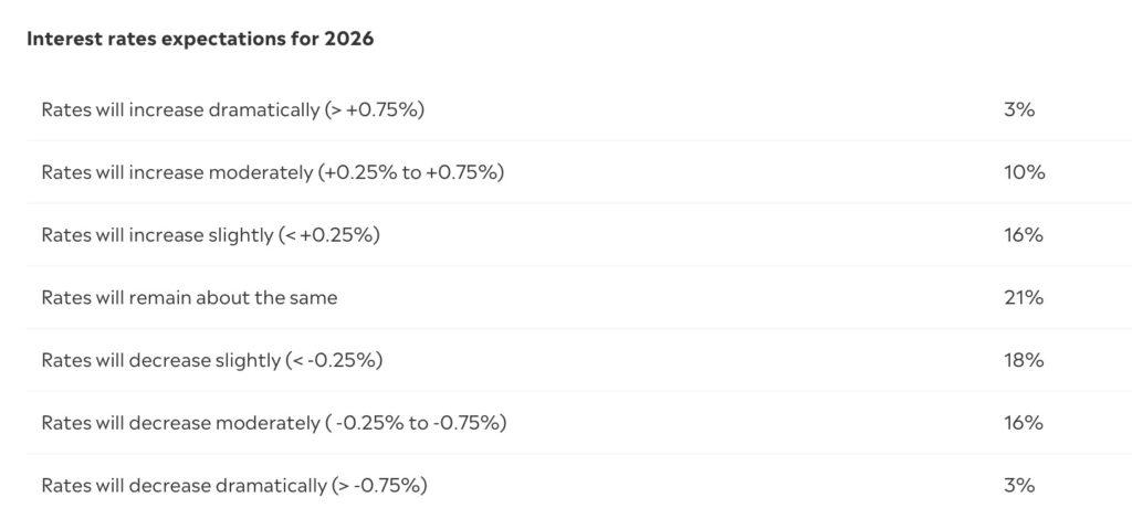 A majority of investors anticipate changes in interest rates in 2026, with 37% expecting a decrease and 29% an increase. Among those who foresee a decrease, 18% predict a slight reduction of up to 0.25%, while 16% expect a moderate decrease between 0.25% and 0.75%.