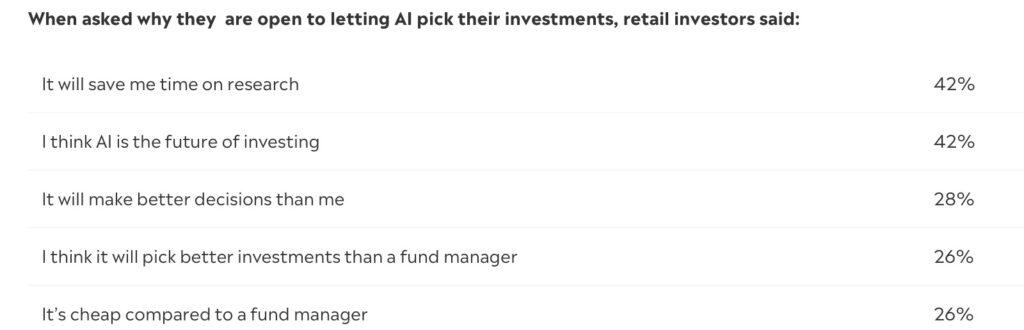 The research revealed that 19% now use AI tools to pick or alter investments in their portfolios, up from 13% a year ago. The proportion of investors across the world open to adopting these technologies remains stable at 39%, compared to 38% last year.