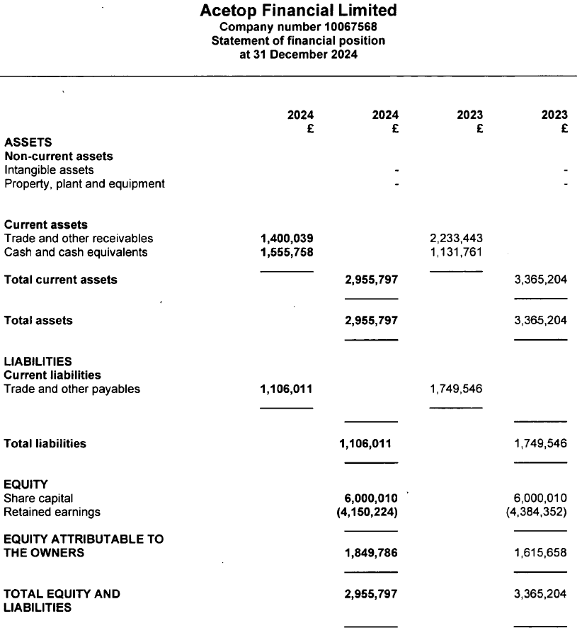 Acetop Financial’s 2024 income statement and balance sheet follow: