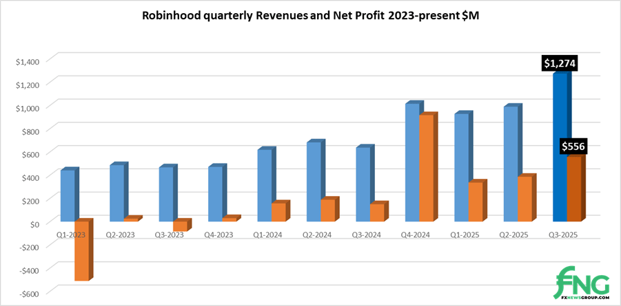Revenues at Robinhood came in at $1.27 billion for Q3 2025, up by 29% from what was a strong Q2. Net Profit totaled $556 million in Q3, 44% up on Q2 and the company’s second most profitable quarter ever.